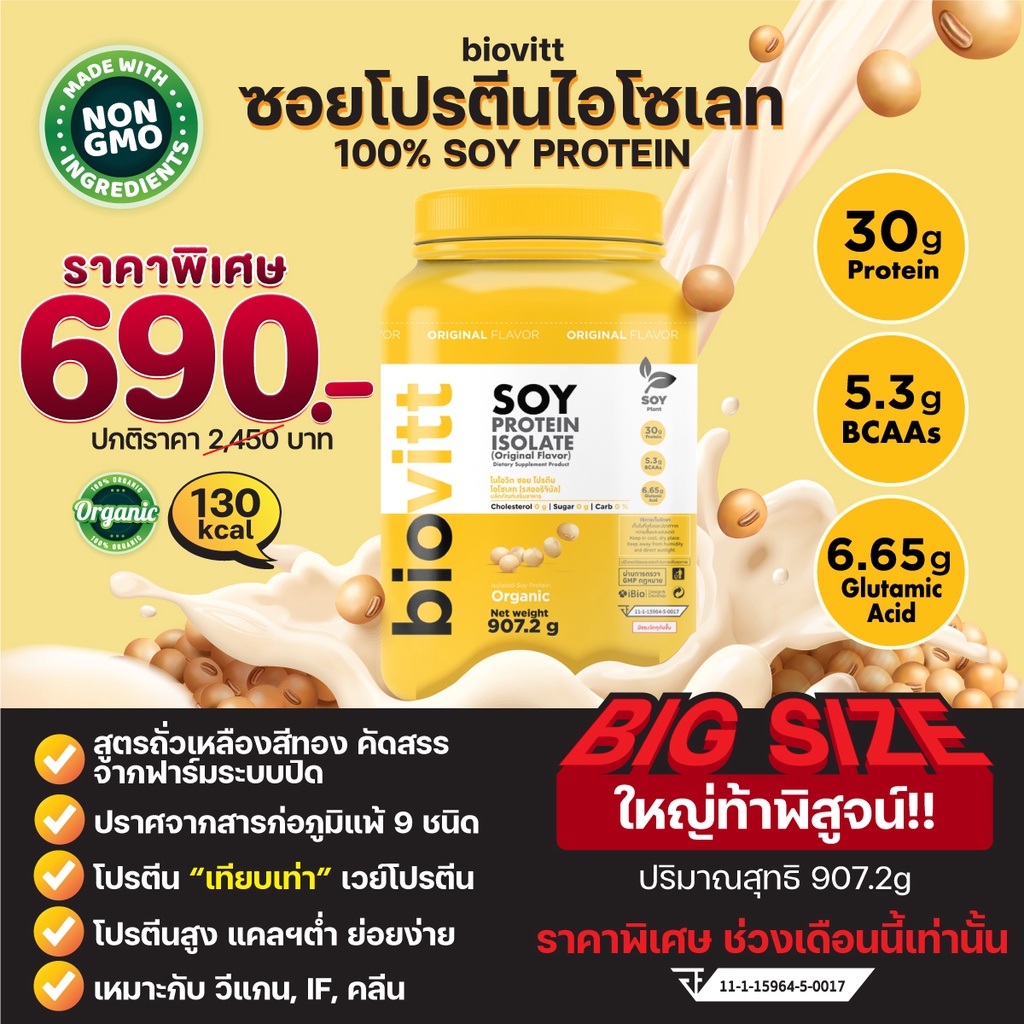 [โปรตีนจากถั่วเหลือง biovitt Soy Protein Isolate โปรตีน ถั่วเหลือง ซอย โปรตีน ไอโซเลท Non Whey อร่อย บรรจุ 2 ปอนด์ ลูกค้าให้คะแนน 58 ราคาตอนนี้ 690 บาท ราคาเดิมที่ขาย 2490 บาท ลดราคาถึง 72% อัพเดทล่าสุดเมื่อ 24/04/2023 สินค้าจัดส่งมาจาก Shopee.co.th