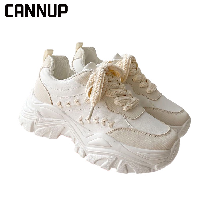 CANNUP รองเท้าผู้หญิง รองเท้าผ้าใบ แฟชั่นสำหรับผู้หญิงเสริมส้น 5 ซม สีขาว 2022 ใหม่ รองเท้าสีขาว 0825002