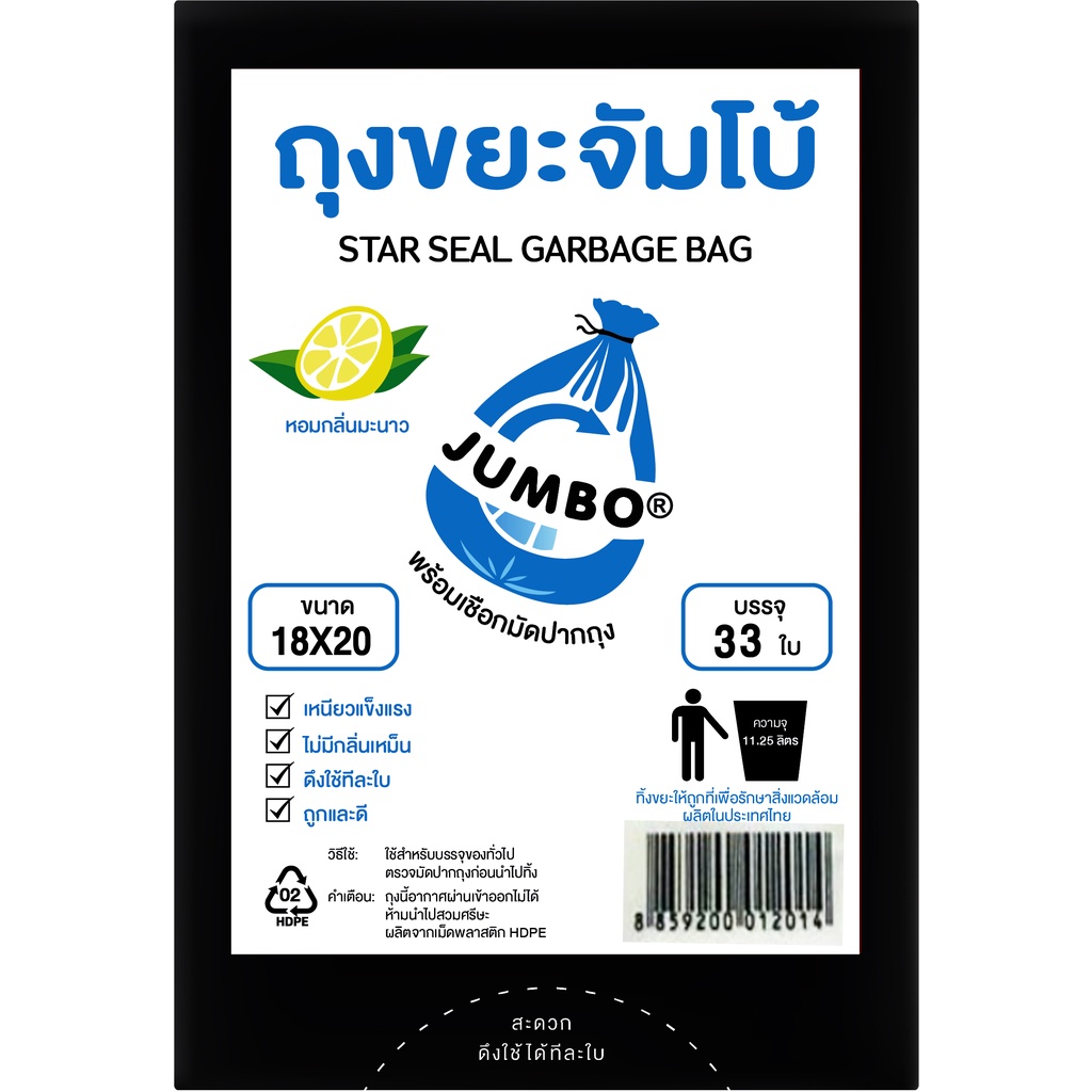 - JUMBO ถุงขยะจัมโบ้ หอมกลิ่นมะนาว พร้อมเชือกมัดปากถุง 5 ขนาด 18x20 , 24x28 , 26x34 , 30x40 , 36x45