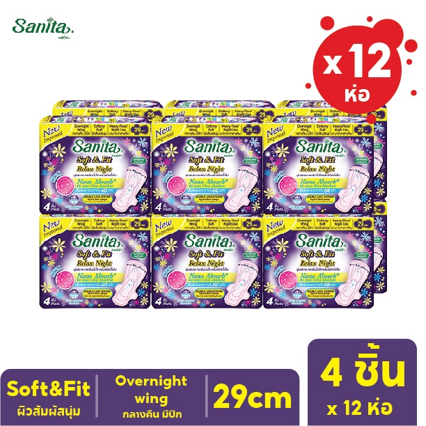 12 ห่อ] Sanita / แซนนิต้า ผ้าอนามัย ซอฟท์ แอนด์ ฟิต ผิวสัมผัสนุ่ม กลางคืน มีปีก 29 ซม 4 ชิ้น/ห่อ