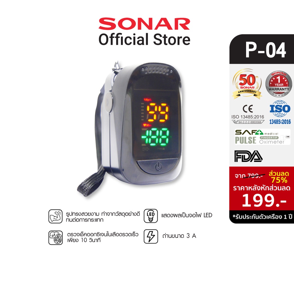 SAFA เครื่องวัดออกซิเจน วัดชีพจร วัดอัตราการเต้นหัวใจ จอดิจิตอล เครื่องวัดออกซิเจนที่ปลายนิ้ว P-04