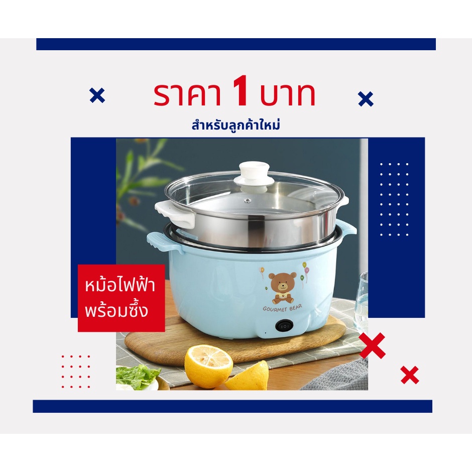 หม้อไฟฟ้าอเนกประสงค์ กระทะไฟฟ้าเอนกประสงค์ หม้อไฟฟ้า หุงข้าว อุ่น ตุ๋น ต้ม นึ่ง 22ซม ลายหมี