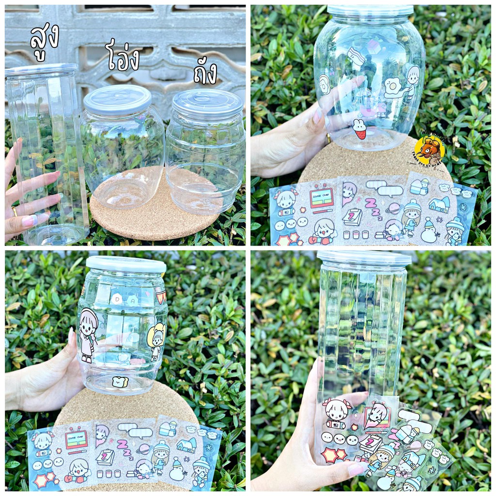 ✨สินค้าพร้อมส่ง✨ กระปุกออมสินใส ทรงถัง โอ่ง สูง สติ๊กเกอร์ไดคัท3แผ่นสุดน่ารัก